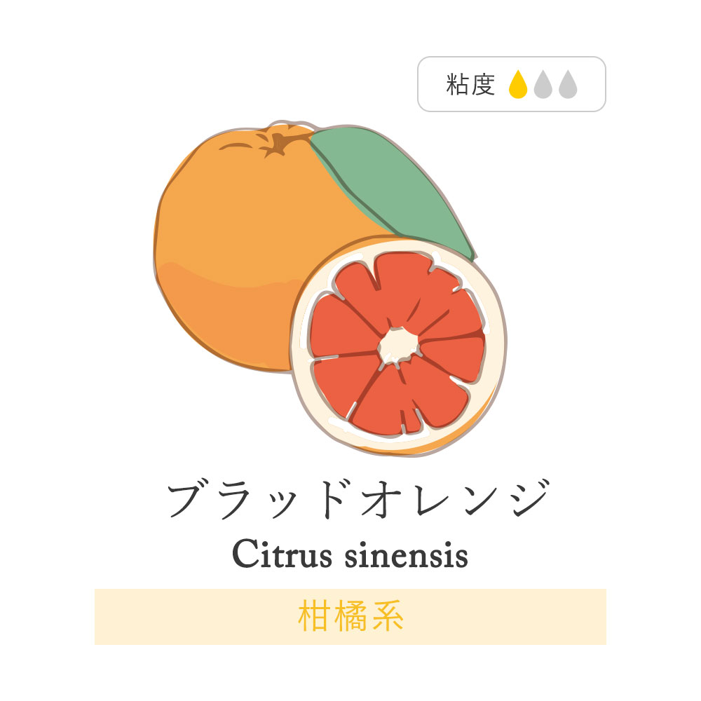 名前 ブラッドオレンジ 英語・漢字表記 Blood Orange 学名 Citrus sinensis 原産国 イタリア 科名 ミカン科 抽出部分 果皮 抽出方法 低温圧搾法 香りの強弱 中から強め ノート トップノート 説明 イタリア原産のブラッドオレンジのオイルです。